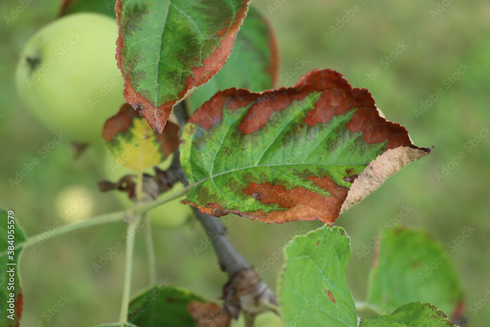 Apple tree leaves with brown spots and edges defromations damaged by infection disease in the orchard