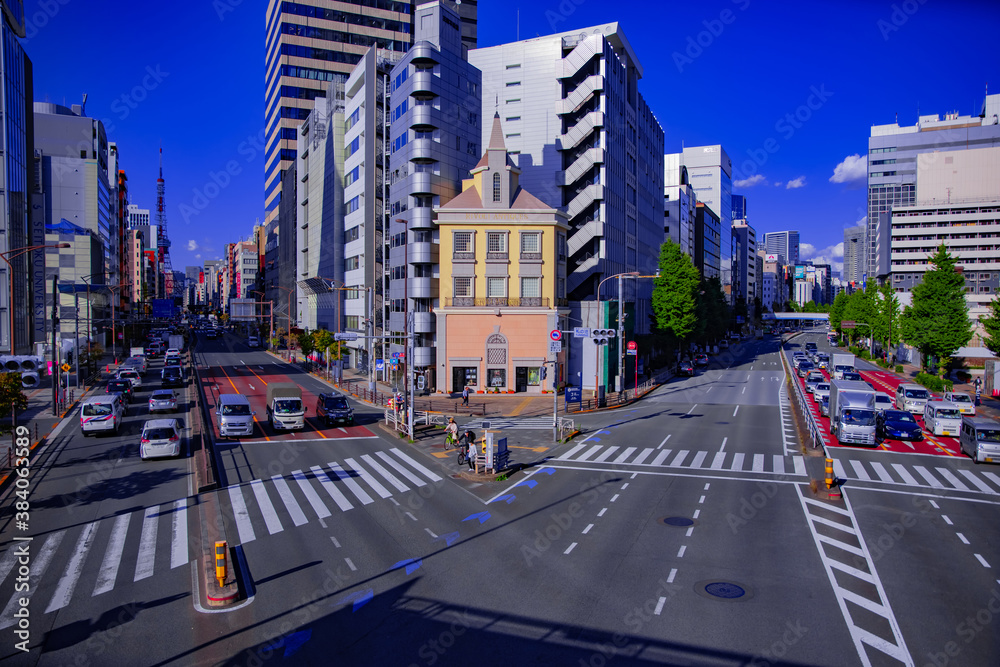 A traffic at the urban street behind Tokyo tower in Tokyo wide shot