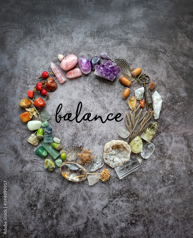 Balance. gemstones on abstract dark background. Crystals Stones Set. healing minerals for relaxation and meditation, spiritual practice. Esoteric and life balance concept