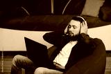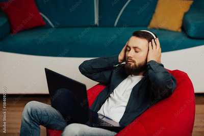 Calm man with closed eyes listening to music while relaxing in red armchair at home. Handsome guy enjoying music on headphones.