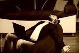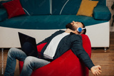 Handsome guy enjoying music on headphones, sitting in armchair with eyes closed.