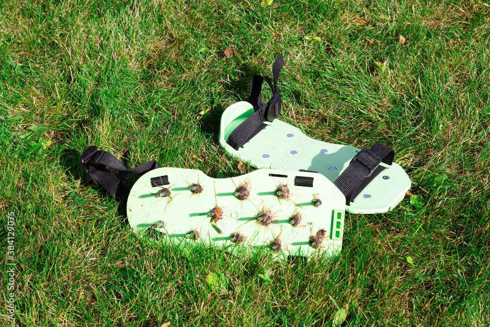 Sandals with spikes for aerating the lawn soil with air. Garden care