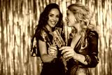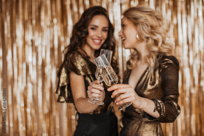 Women brunette and blonde have fun at party and clink glasses on shiny background