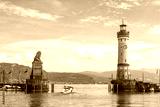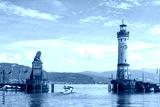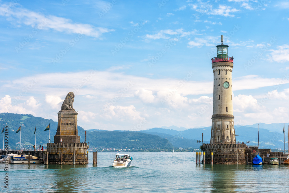 Harbor entrance at Lake Constance, Lindau, Germany. Beautiful landscape with lion statue and lighthouse.
