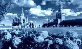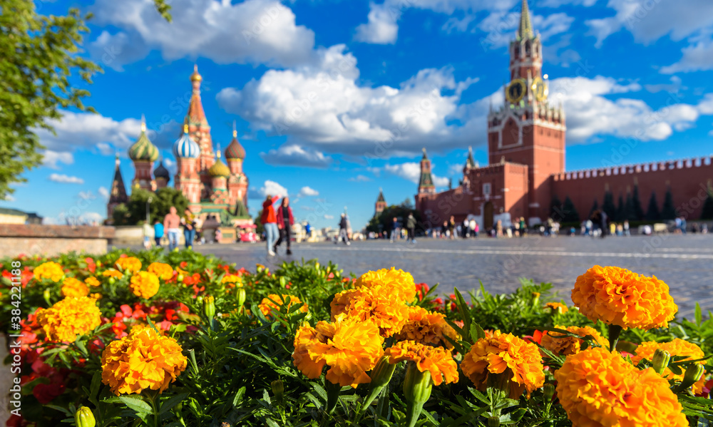 Red Square in summer, Moscow, Russia. Flowers overlooking St Basil’s cathedral and Moscow Kremlin, focus on foreground.
