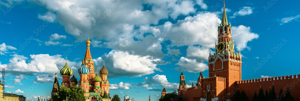 Moscow panoramic view in summer, Russia. St Basil’s cathedral and Moscow Kremlin on blue sky background.