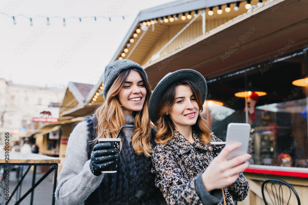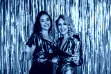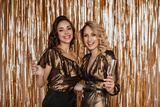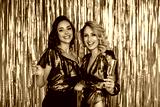 Women with smiles look into camera and hold glasses of champagne on gold background