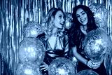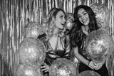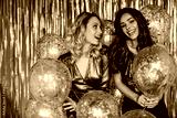 Joyful girls with wavy hair enjoying party and posing with balloons on gold background