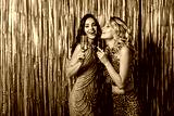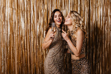 Curly women hold glasses of champagne. Ladies in dresses with shiny stones posing on golden background