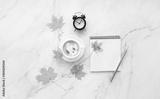 coffee cup, notepad, maple leaves and alarm clock. autumn composition. fall season concept. mock up. copy space. flat lay.