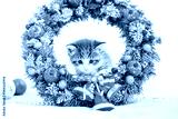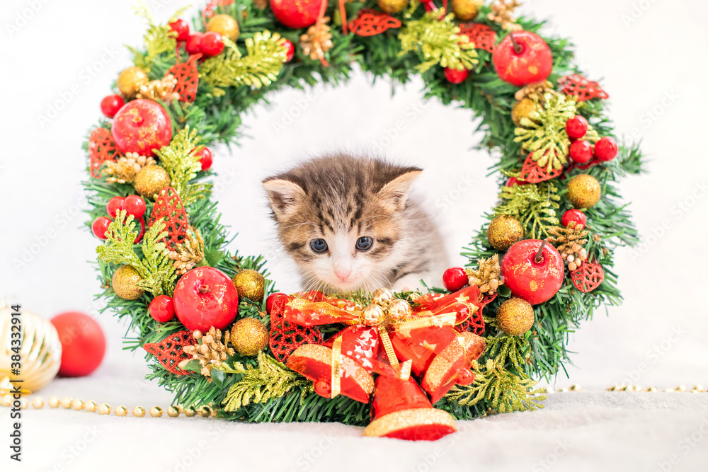 little funny gray striped kitten looks out from a Christmas wreath on a white background.