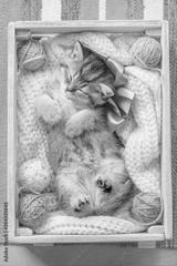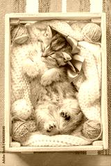 Cute kitten with a bow sleeping in a box with balls of yarn