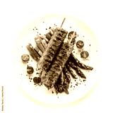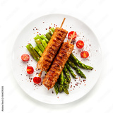 Fried meat with asparagus on white background