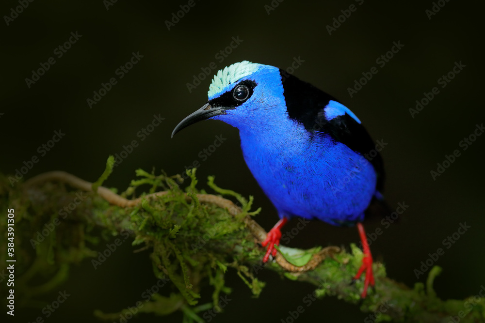 Red-legged Honeycreeper, Cyanerpes cyaneus, exotic tropical blue bird with red legs from Costa Rica. Tinny songbird in the nature habitat. Tanager birdwatching in South America.