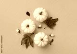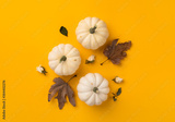 Flat lay autumn and halloween composition. Pumpkins and dried flowers on yellow background