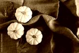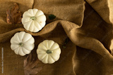 Happy halloween holiday concept. White pumpkins on sack surface