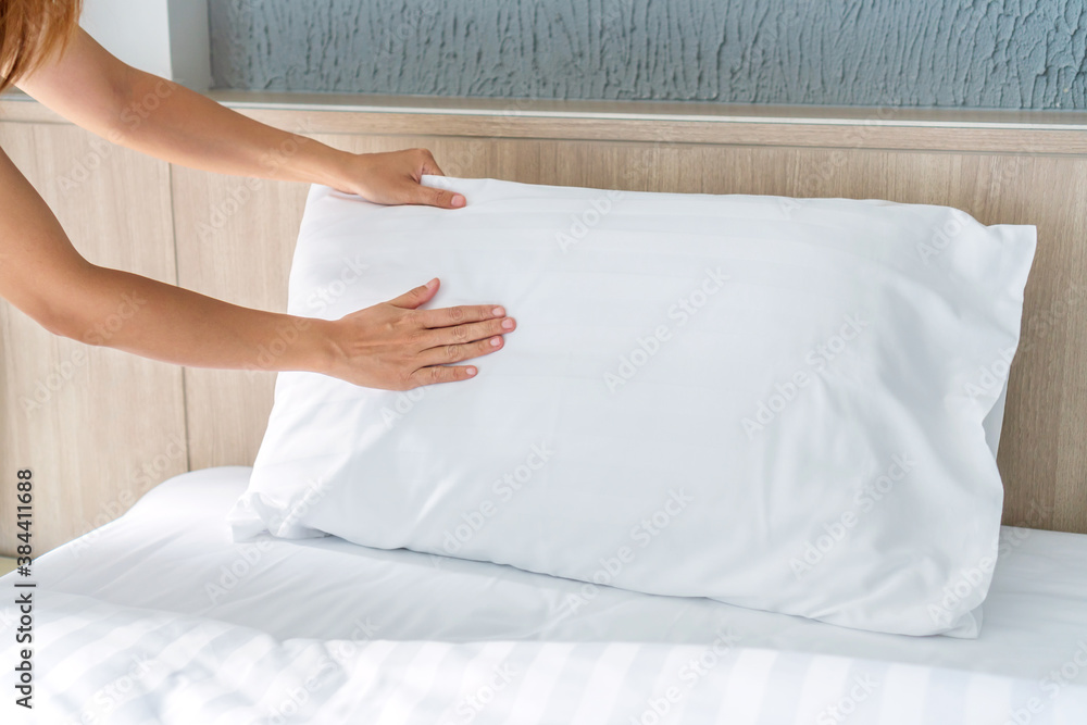 Close up of a female chambermaid making bed in hotel room. Copy space