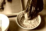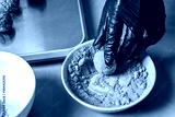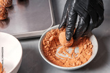 A black-gloved cook prepares date sweets and rolls them in a carob
