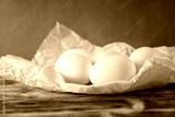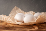 Rustic chicken eggs on parchment paper on a wooden plank table. Close up.