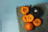 Top view decorative pumpkins on green napkin. Autumn harvest composition on trendy earth tones color background. Autumn, fall, thanksgiving, halloween minimalism concept. Selective focus. Copy space.