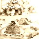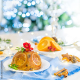 Traditional English Christmas pudding decorated with oranges and flowers in a festive table setting with fruits, spices, lights of Christmas tree on background. Copy space. Magical mood. Square card.