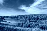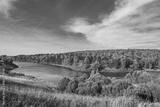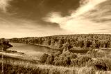 autumn landscape of lake and orange forest on the slope. panoramic view of the forest river on a sunny autumn day