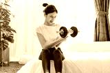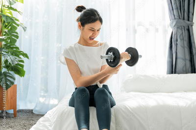 Asian woman sitting on the bed and doing exercises with lifting dumbbells that are too heavy. wellness concept.
