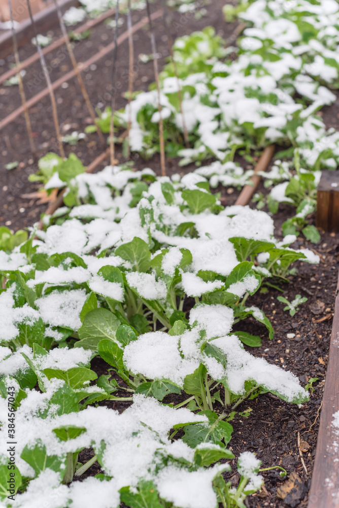 Homegrown Asian bok choy on backyard garden with snow covered in Dallas, Texas, USA