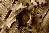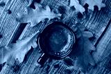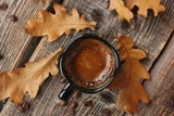 Espresso coffee and oak leaves on the table