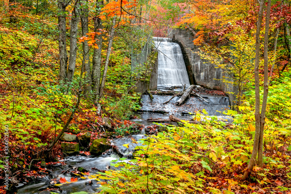 Lower Hungarian falls in Michigan upper peninsula near Hancock city surrounded by fall foliage.