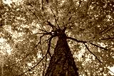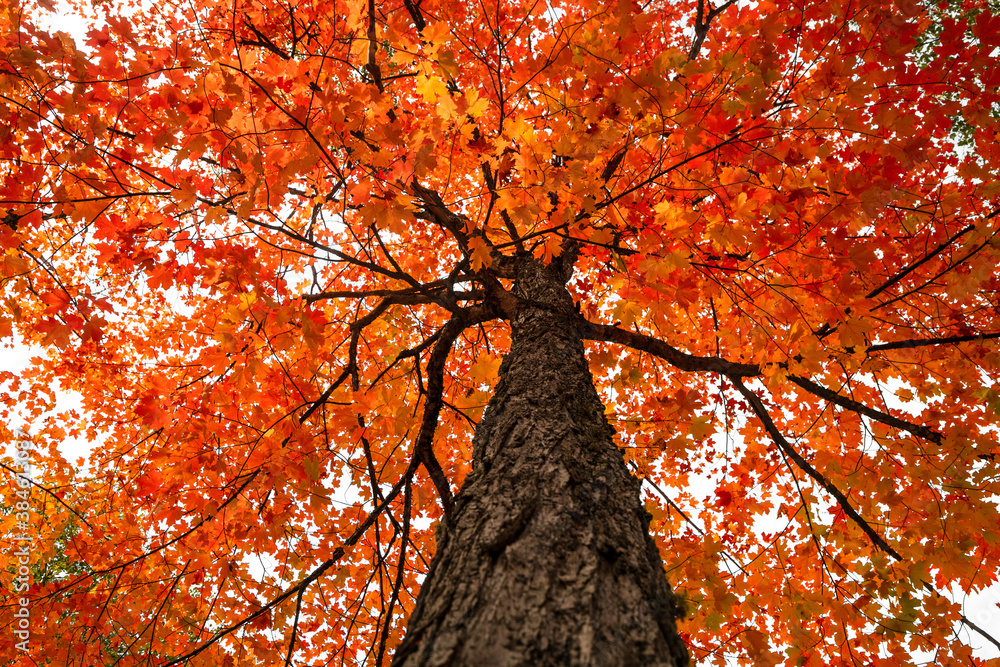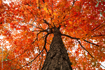 Bright red Maple tree in autumn time, view from bottom of tree.