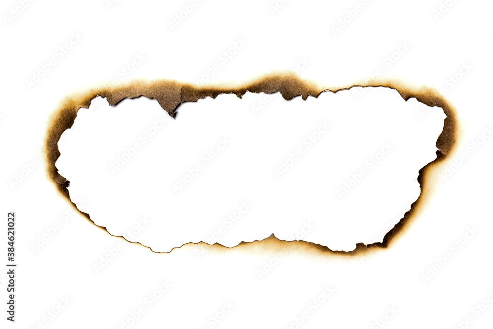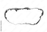 Fire burned hole white paper background texture isolated on white background. Paper burn mark stain