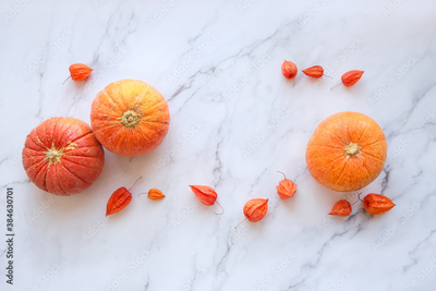 autumn composition. orange pumpkins and physalis on marble background. Fall season concept. thanksgiving and halloween holiday. flat lay. copy space