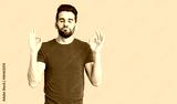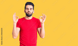 Young handsome man with beard wearing casual t-shirt relax and smiling with eyes closed doing meditation gesture with fingers. yoga concept.