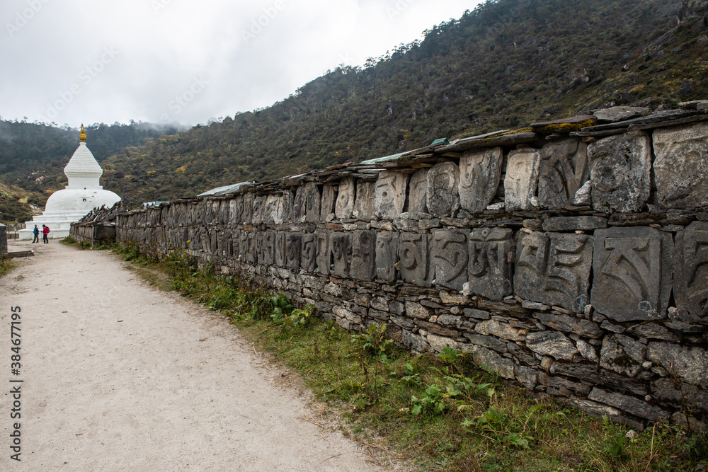 Mani walls in Khumjung village the green village of Sherpa community in Khumbu region of Nepal. Mani stones are stone plates carved with the six syllabled mantra of Tibetan Buddhism.
