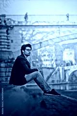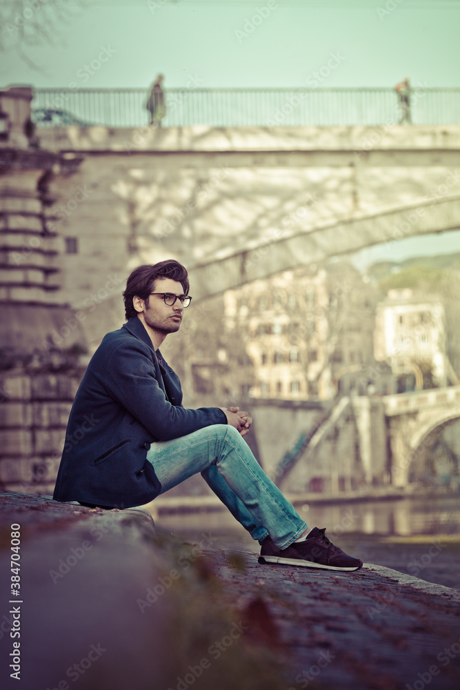 Handsome young man sitting in the city center. Relaxing and thinking in urban scenery. Fashionable clothes, blue jacket and jeans. Glasses. Bridge and city life in the distance. Rome, Italy.