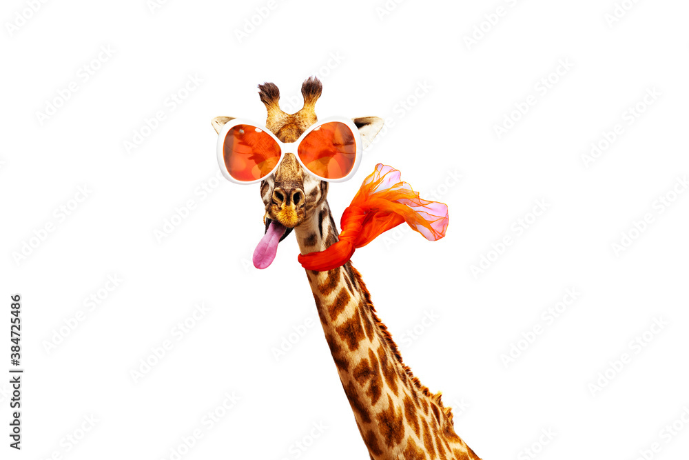 Funny photo of giraffe in orange sunglasses and scarf isolated on white