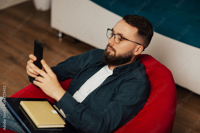 Handsome man in casual wear and eyeglasses are using smartphone while sitting in armchair in living room.
