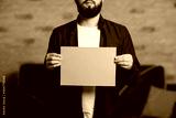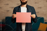 Man holding pink blank card blank, empty paper, billboard with copy space for text. Cropped photo.