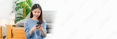 Startup small business, Young Asian woman checking online order on smartphone and packing boxes for products to send to customers. working at the home office. white copy space of the banner for ads.