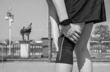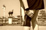 Runner woman holding her knee while she having suffering from knee pain and she wearing knee braces for supports to be worn when you have pain in your knee.