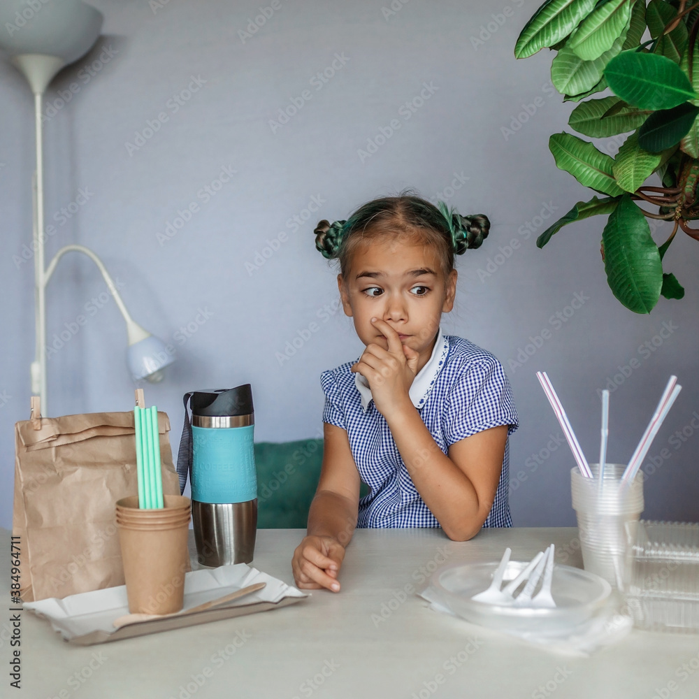 Plastic free and zero waste concept. Girl making a choice between plastic and paper set of dishes