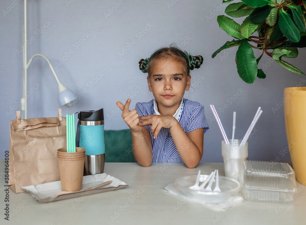 Plastic free and zero waste concept. Girl making a choice between plastic and paper set of dishes