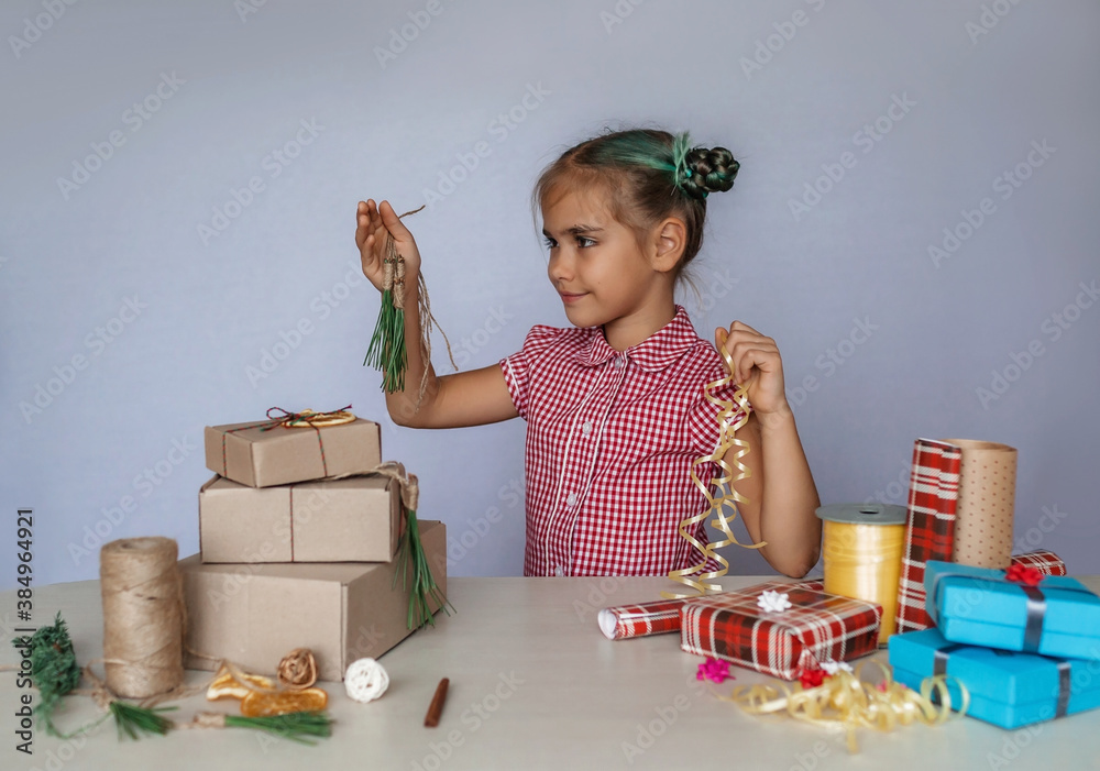 DIY decoration. Girl making a choice between common packed box and wrapping with natural materials