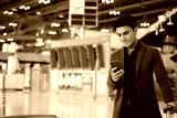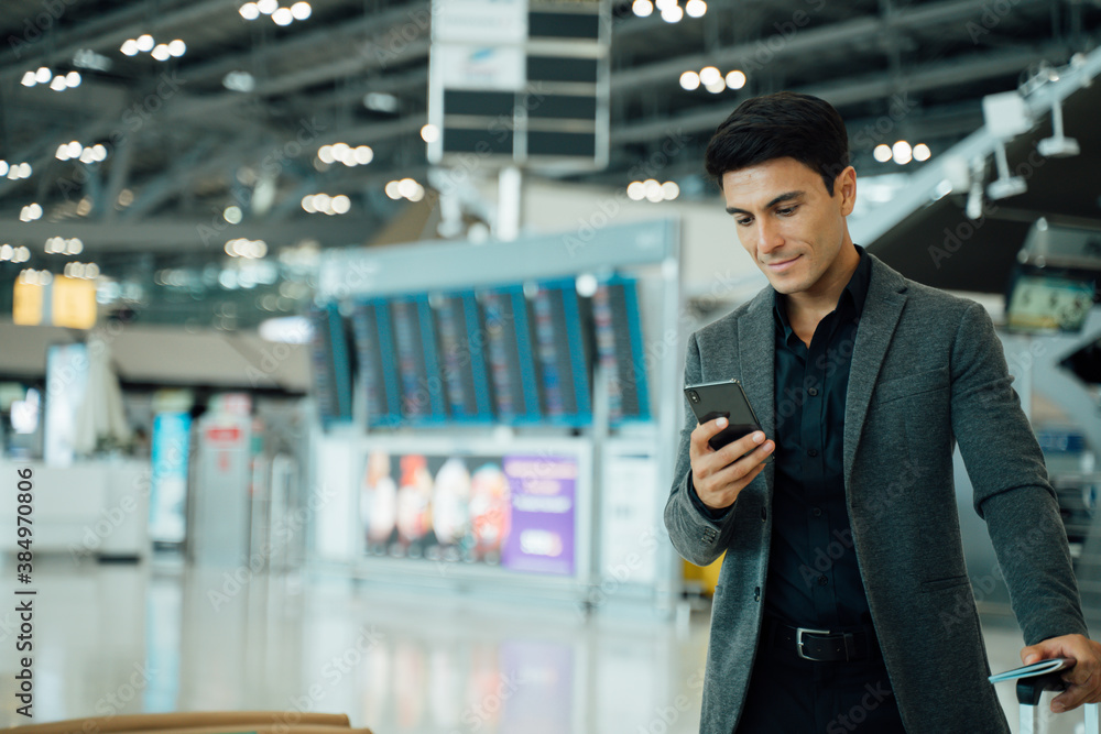 Portrait of young Elegant businessman using mobile phone app check-in boarding pass in airport.Handsome business professional man wearing suit texting smartphone inside office building or terminal