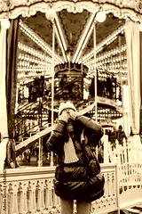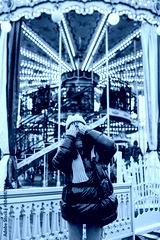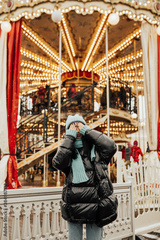 Young stylish girl in a fashionable clothes posing near a vintage carousel in the city. She relaxing in amusement park in winter.