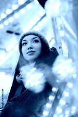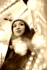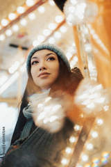 Happy attractive girl in dressed warm, are walking in a Christmas park with many lights around. Selective focus.