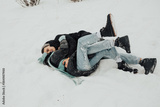 Happy couple lying on snow are laughing and hugging. They enjoying snowy weather in the forest. Copy space. Selective focus.