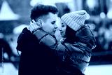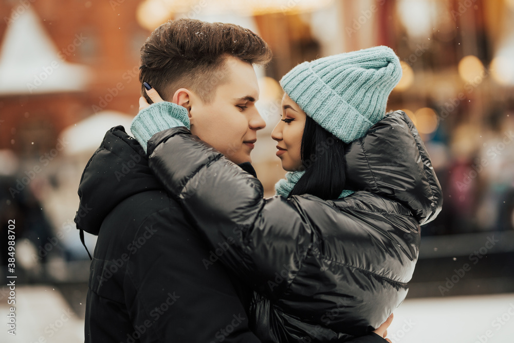 Close up portrait of young beautiful happy smiling couple. They hugging and looking at each other. Winter holidays, dating concept. Day light, snowfall.