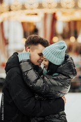Close up teenagers couple in love hugging in the cold winter day. They posing in cold weather.
